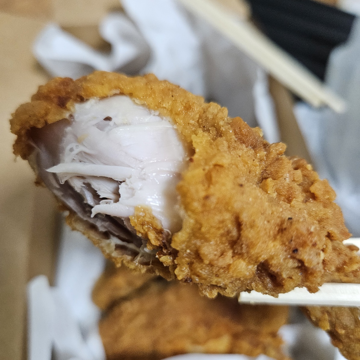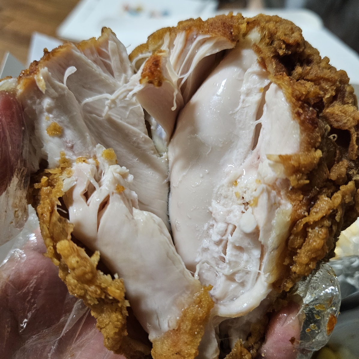 보통 튀긴 치킨의 가슴살 부위는 퍽퍽하기 마련인데 이 집의 치킨은 가슴살 부분도 많이 안 퍽퍽하고 부드럽고 맛있더라고요. 신선한 닭을 사용한 게 느껴집니다.