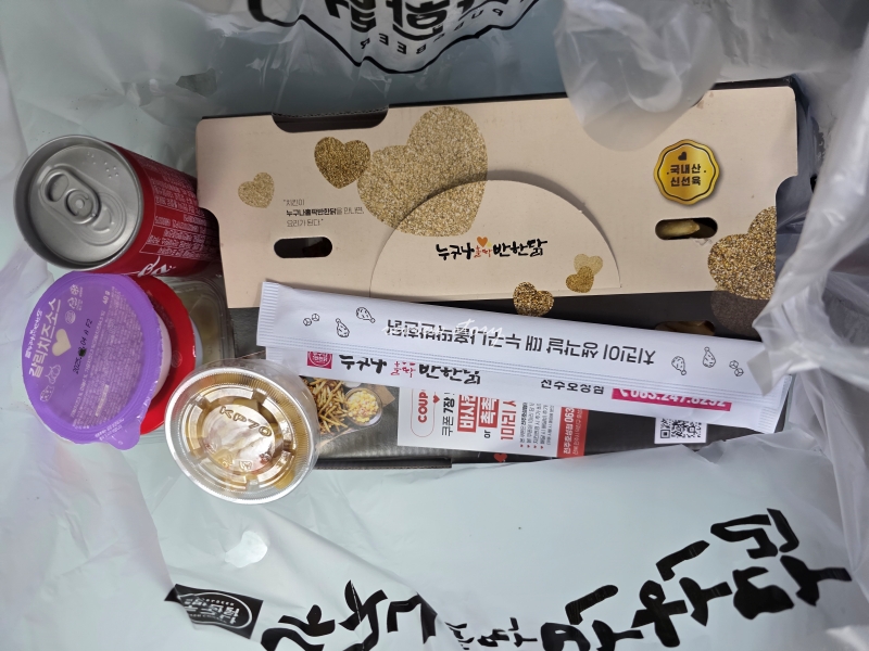 구성품 : 치킨, 나무젓가락, 캔콜라, 치킨무, 콘샐러드, 갈릭치즈 소스, 칠리소스, 쿠폰1매
