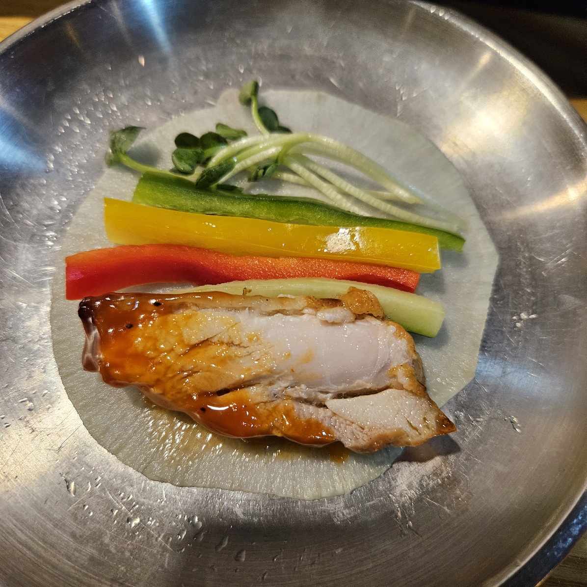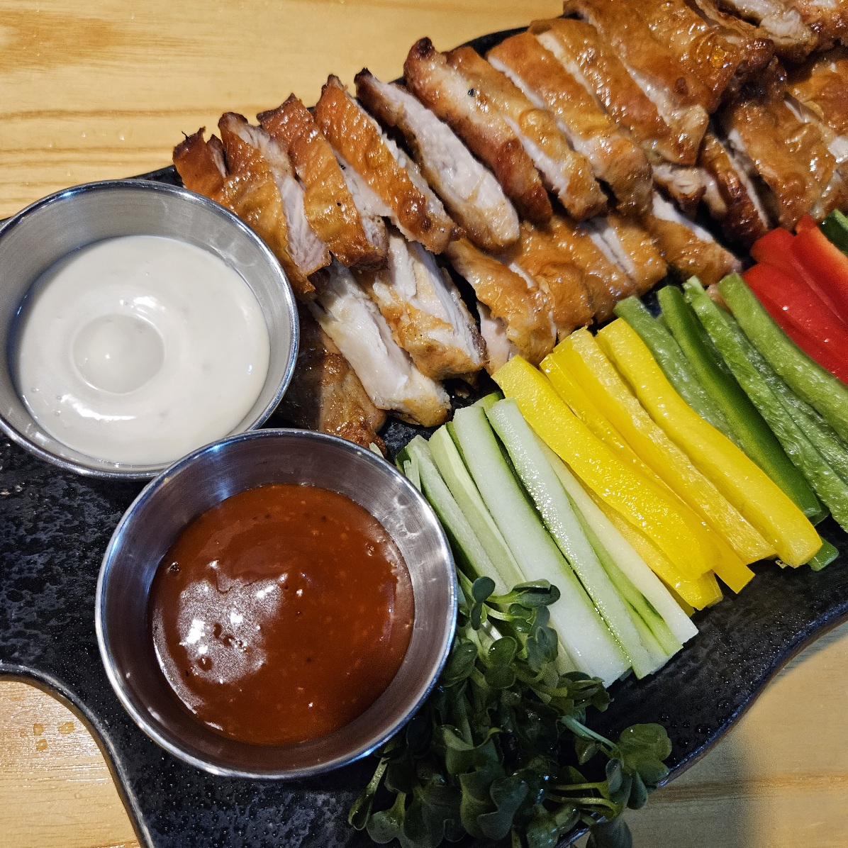 양쪽으로 소스 2종과 쌈무까지 더해져 여러 조합으로 다양하게 맛볼 수 있는 쌈닭!