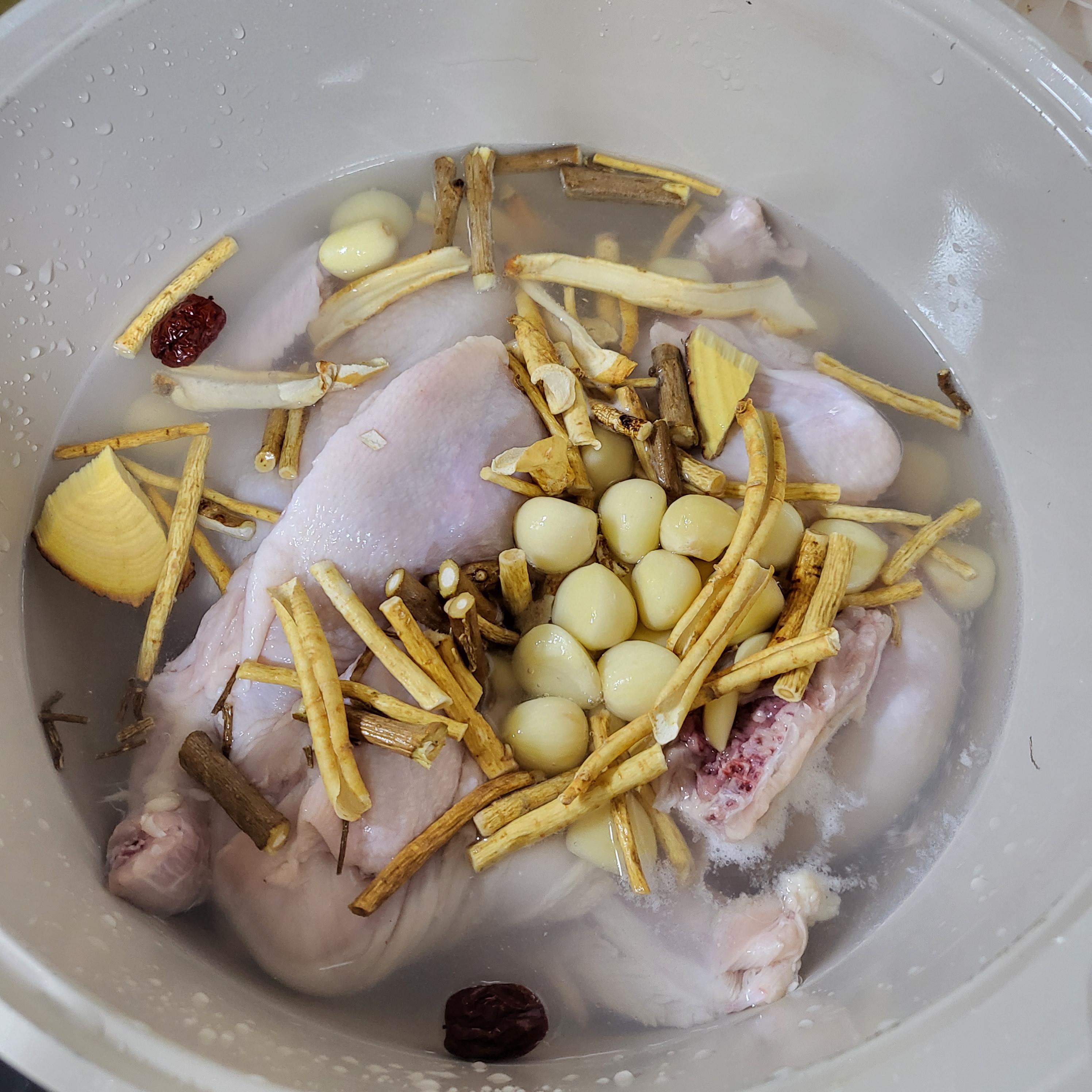 물에 손질한 닭과 각종 한방재료와 마늘 대추 넣고 삶을 준비를 합니다.