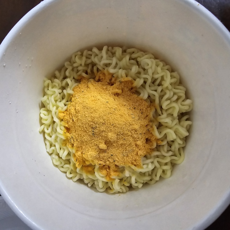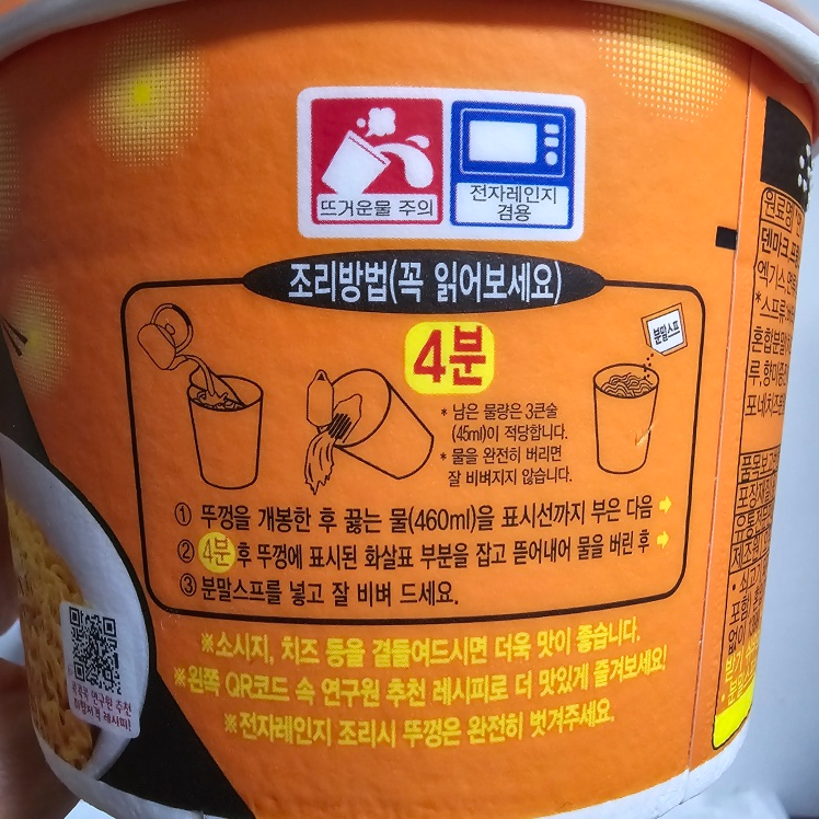 뚜껑을 개봉한 후 (건더기스프)를 넣고 끓는 물(460ml)을 표시선까지 부은 다음 4분 후 뚜껑에 표시된 화살표 부분을 잡고 뜯어내어 물을 버린 후 분말스프와 (마요네즈)를 넣고 잘 비벼 드세요.