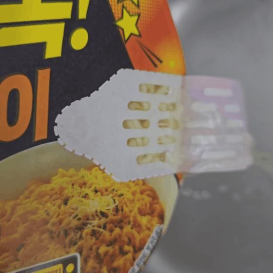 뚜껑을 개봉한 후 뜨거운 물을 부어줍니다. 마요짜장볶이는 건더기 스프를 넣어줍니다. 뚜껑에 표시된 화살표 부분을 잡고 뜯어내어 물을 버리면 됩니다. 라면이 쏟아질 일도 없고 편하게 버릴 수 있습니다.