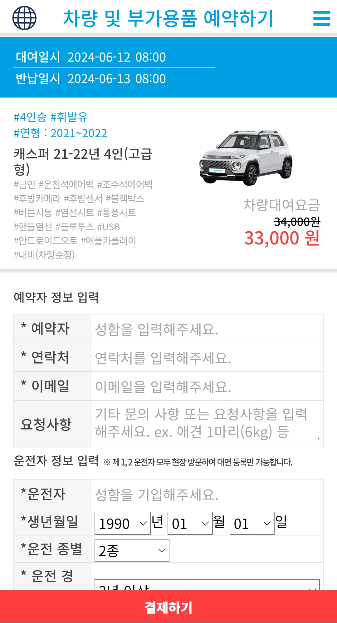 마음에 드는 차량을 선택했다면 예약을 진행하게 됩니다.