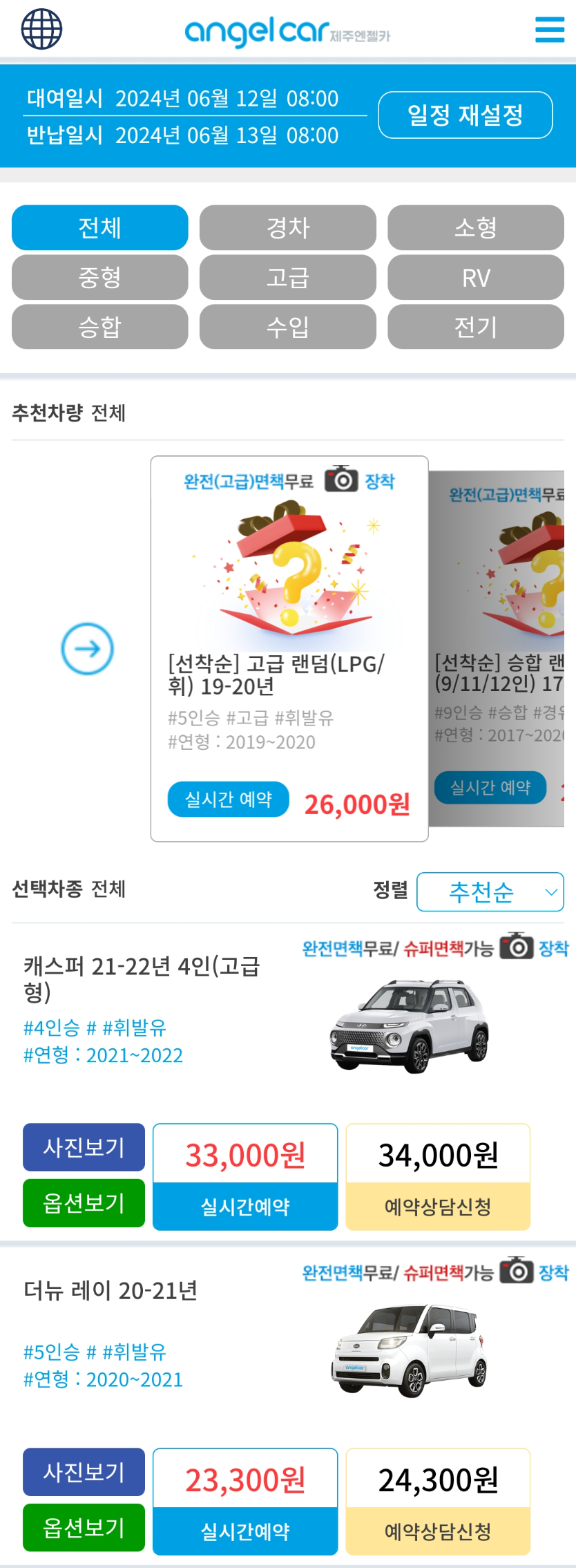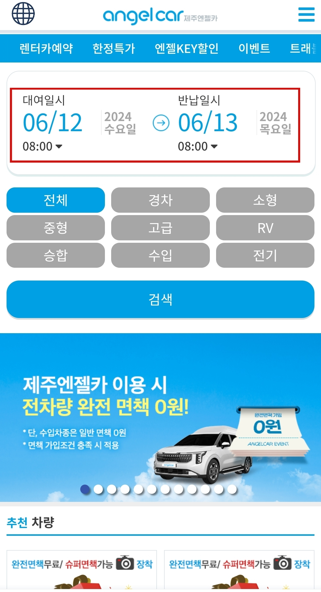 엔젤카 홈에서 대여일시와 차종을 선택해서 검색합니다.