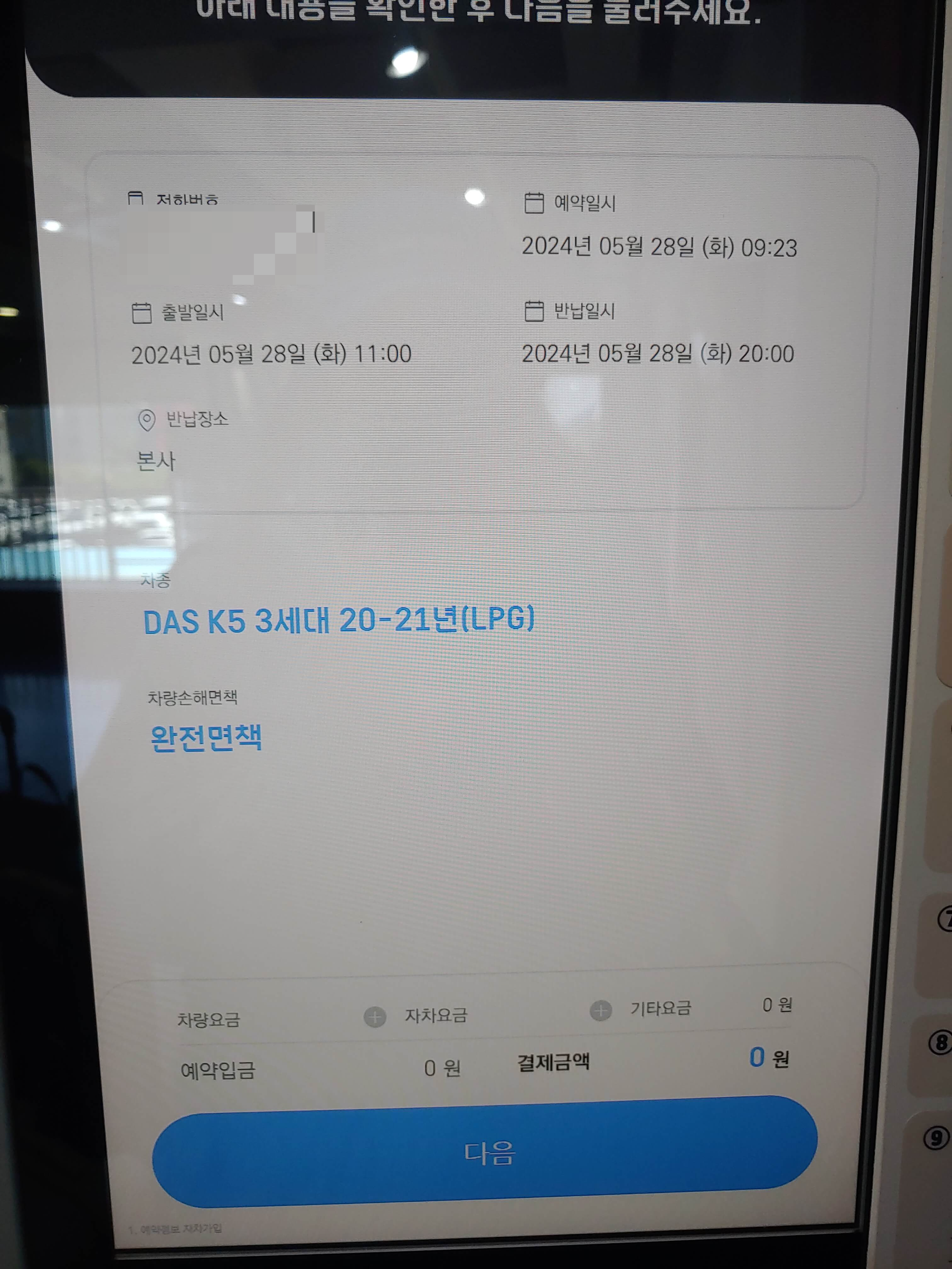 예약정보를 입력하고 면허증 확인 후 진행하면 차량 인수증을 받을 수 있습니다.