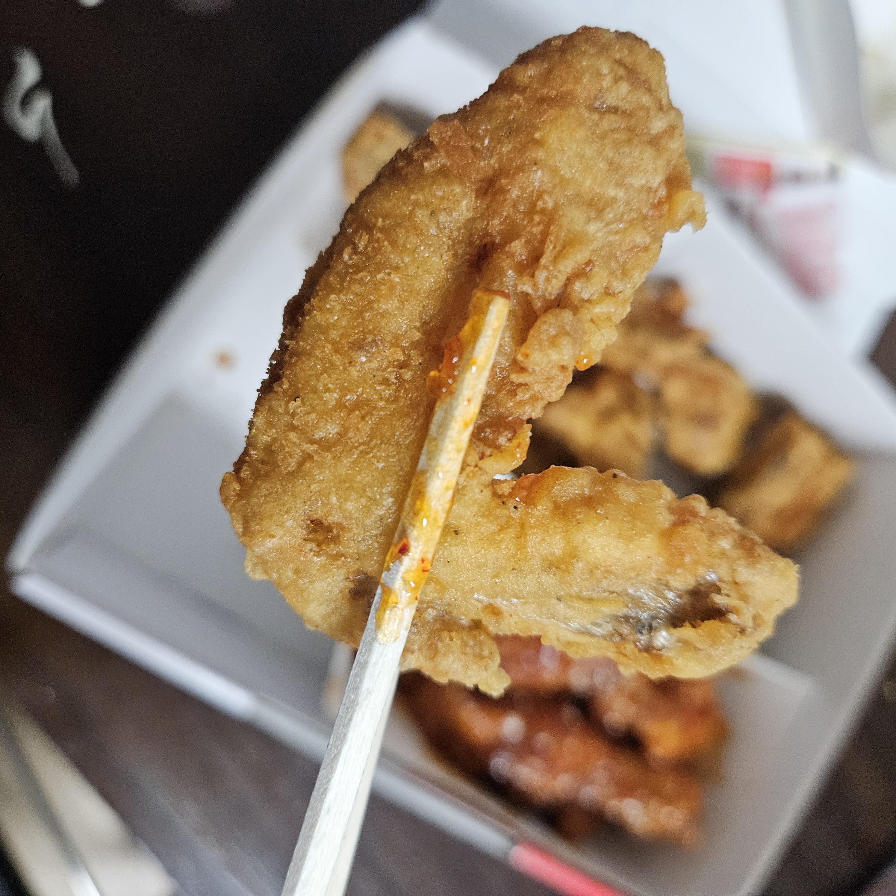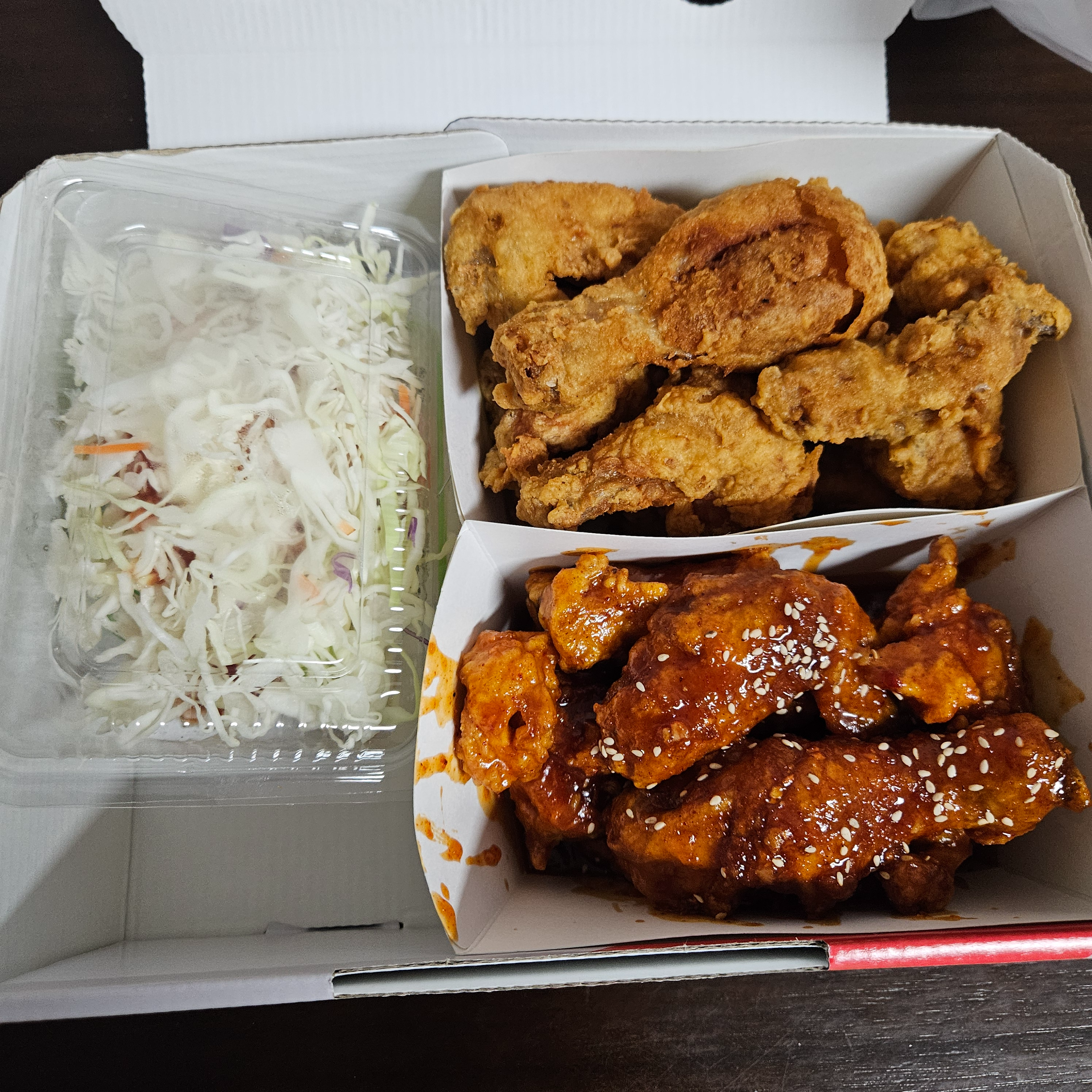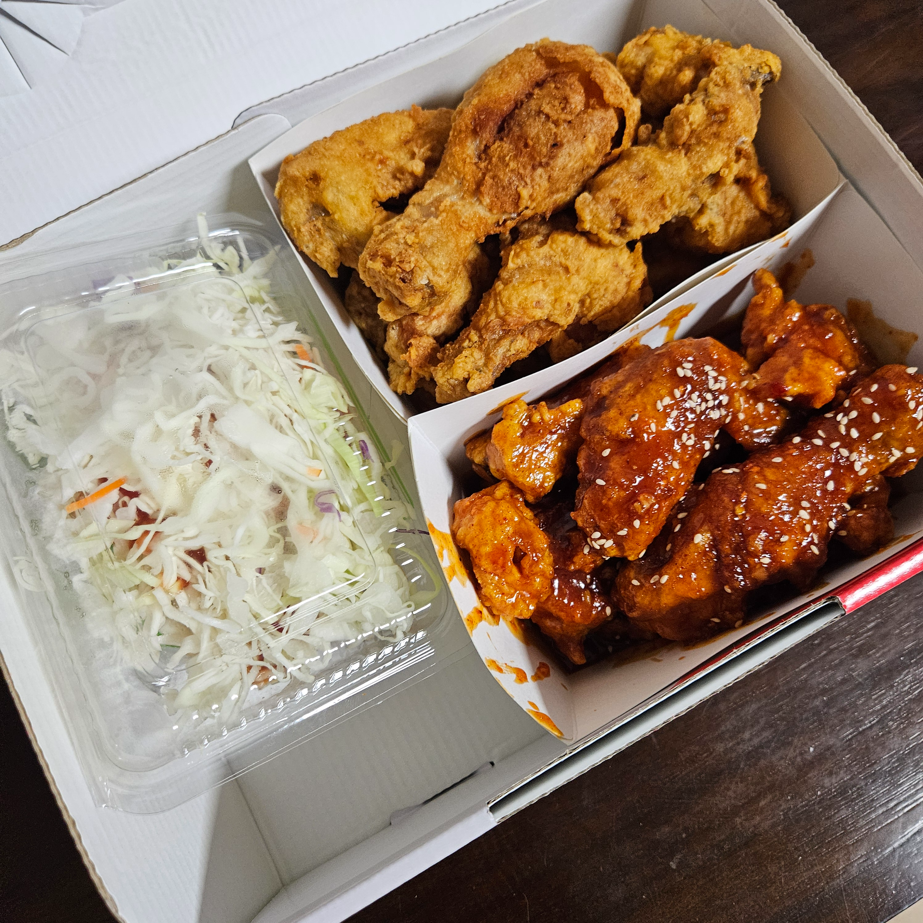 박스를 열어보니 양념반 후라이드반씩 박스에 나눠져 담겨있습니다!