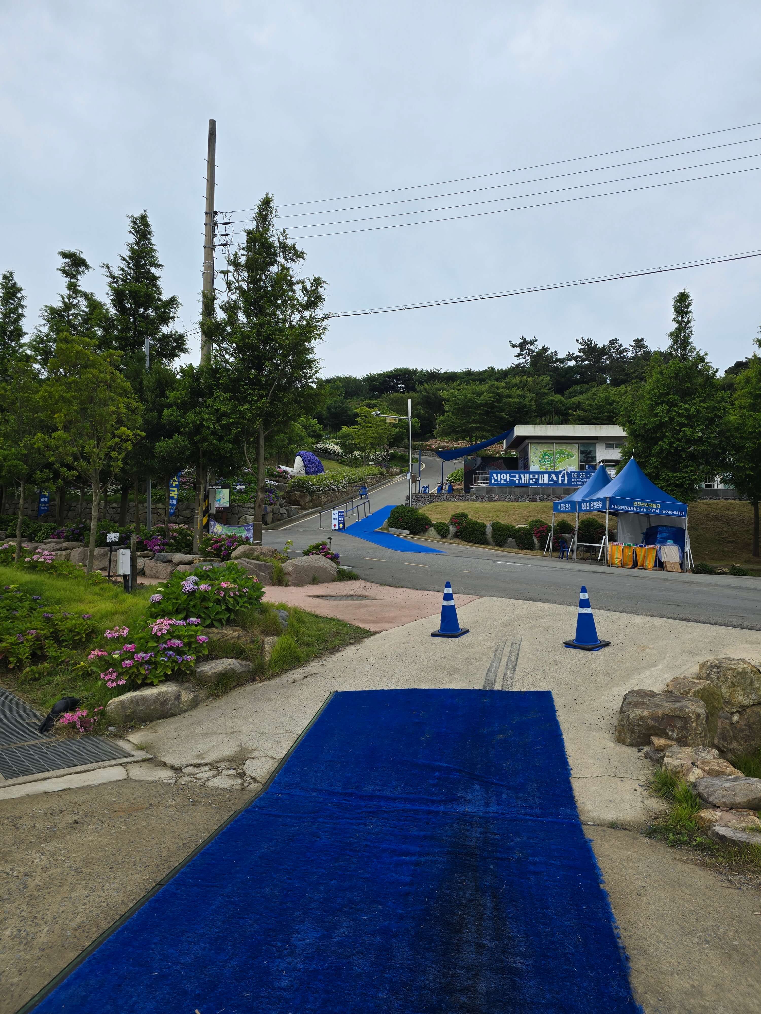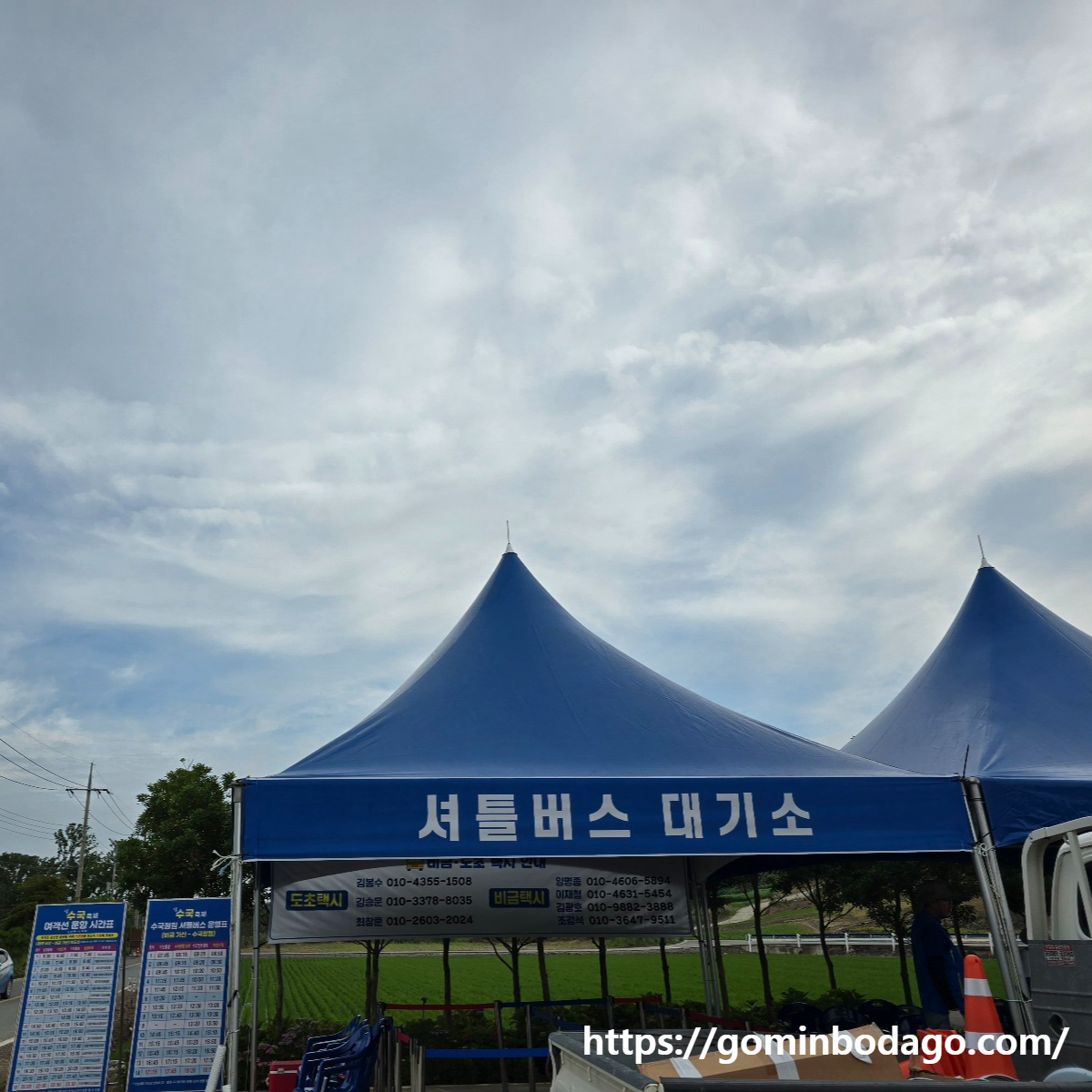 배 내리는 시간에 맞춰서 다니는 셔틀버스가 운행 중입니다. 버스를 타고 바로 수국정원 앞까지 올 수 있습니다. 갈 때도 이곳에서 대기를 하고 있다가 셔틀버스를 이용하면 됩니다.