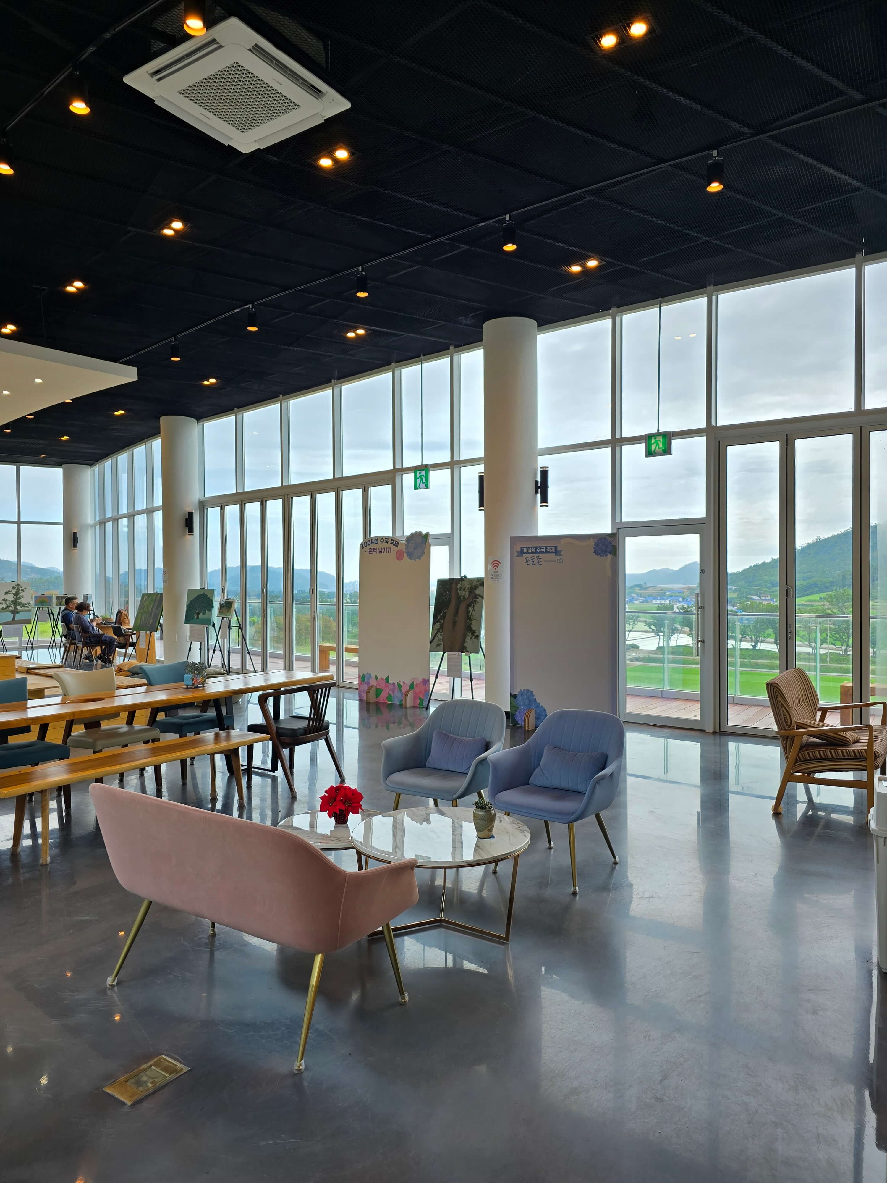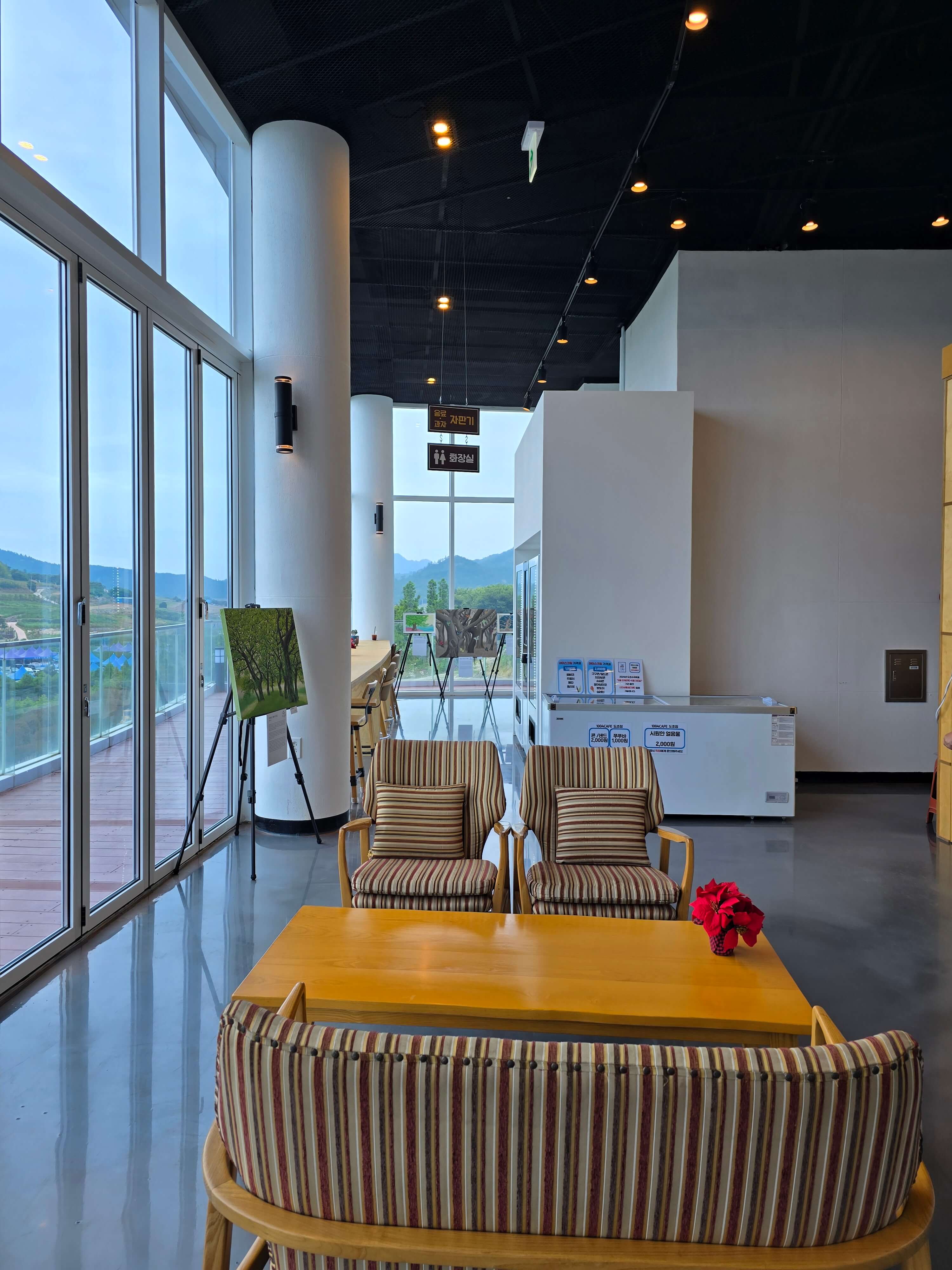 통창으로 바깥을 바라볼 수 있게 만든 카페에서 잠시 쉬었다 가는 것도 좋습니다. 카페 안에 화장실도 있습니다.