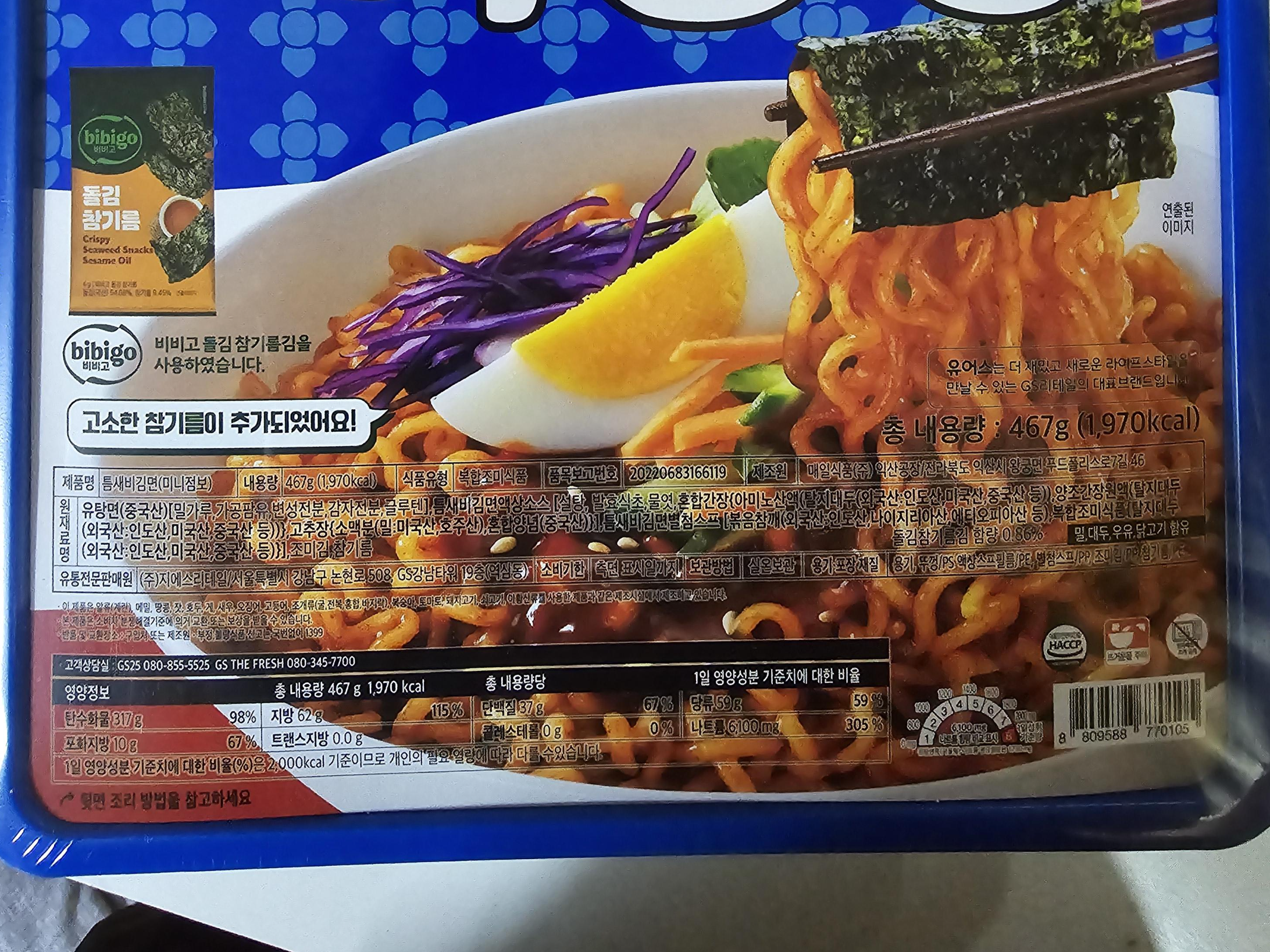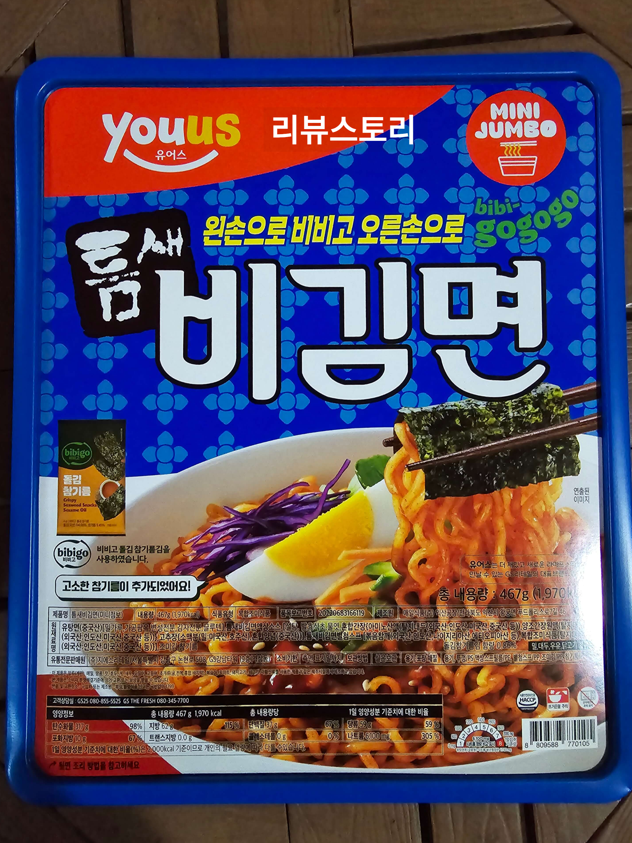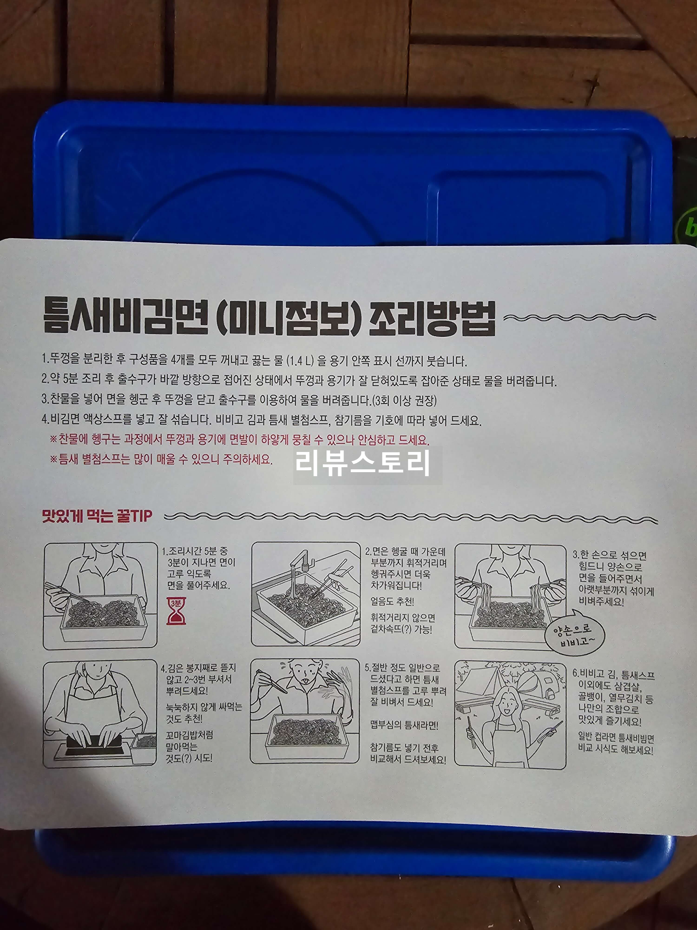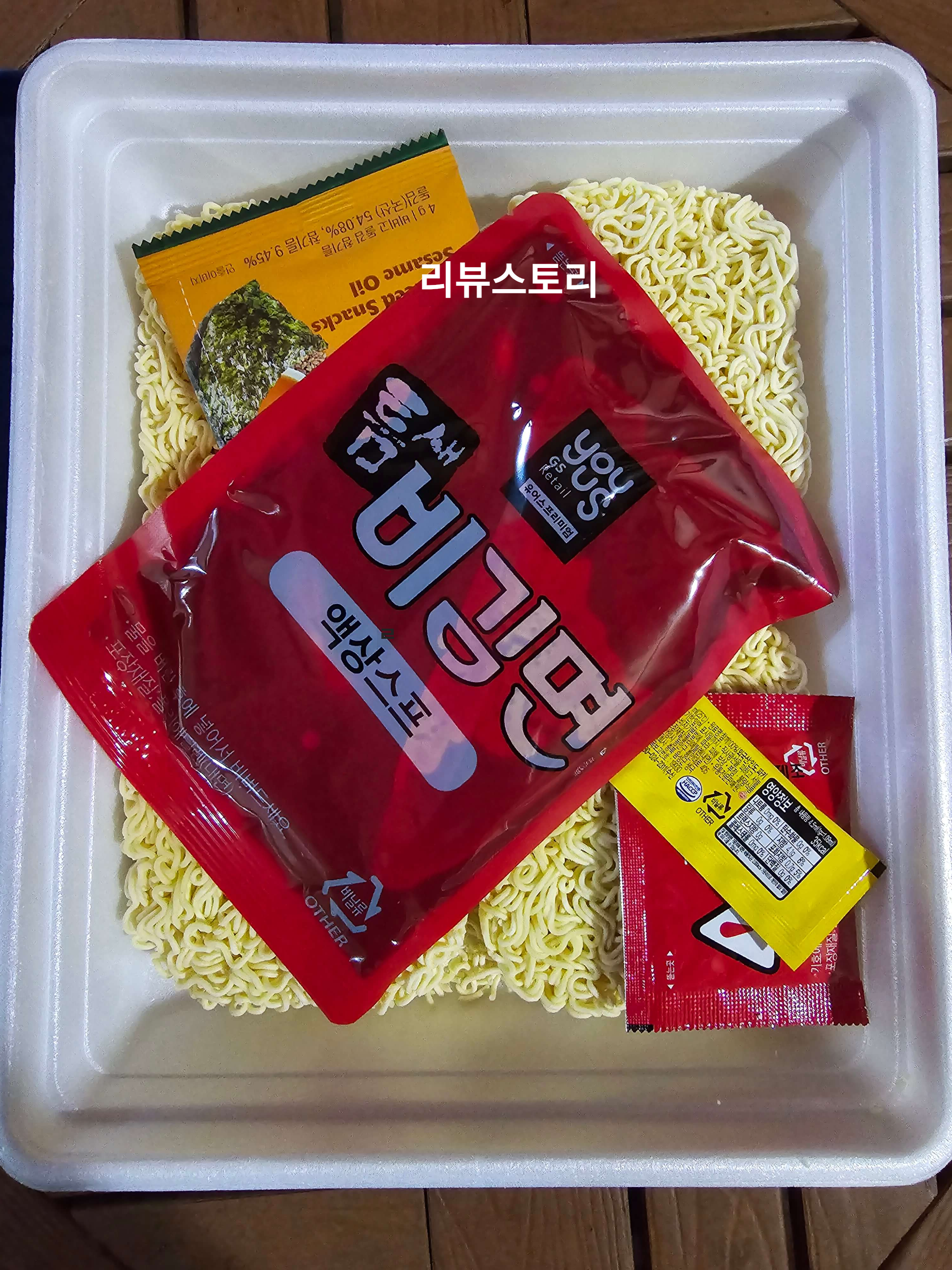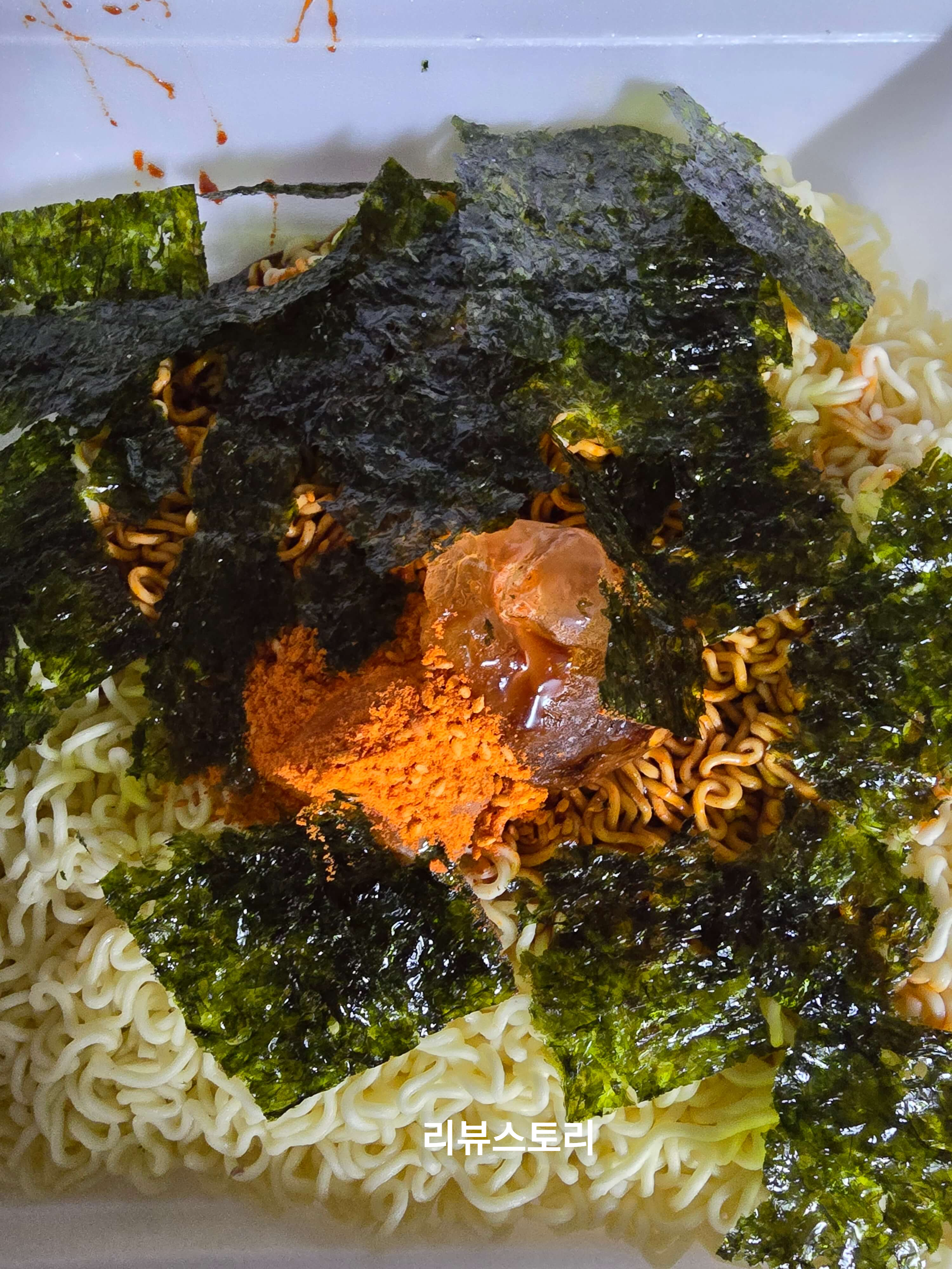 틈새 별첨스프까지 넣었지만 그렇게 매운맛은 아니고 팔도비빔면과 큰 차이는 느끼지 못했습니다.(개인차 있음) 그리고 김은 면에 비해 부족합니다. 섞어서 먹는 것보다 따로 싸 먹는 것이 더 낫다고 하니 참고하세요.
